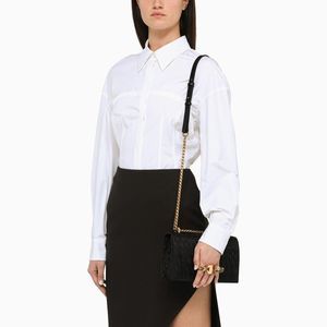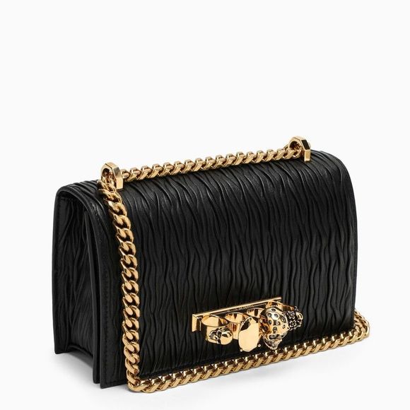 Black pleated nappa leather bag from Alexander McQueen featuring an adjustable chain and leather shoulder strap, a front flap with magnetic closure, four gold-tone rings and Swarovski crystals on the front, two compartments, a flat zipped pocket, a central pocket and gold-tone metal hardware. Material: Leather. SKU: 2F-554128DYTBA/L_ALEXQ-1000_100