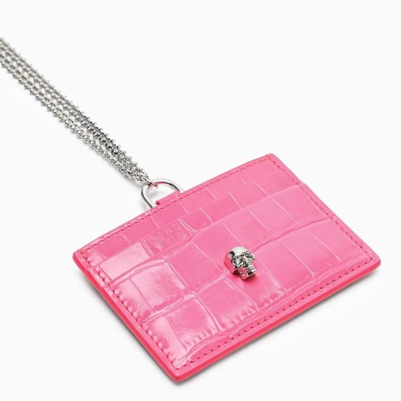Chain-strap card holder by Alexander McQueen in shiny neon pink embossed croc calfskin leather, featuring decorative silver skull on the front, chain strap, four credit card slots and one central compartment Material: Leather. SKU: 2F-6480151JMUA/K_ALEXQ-5908_100-parent.