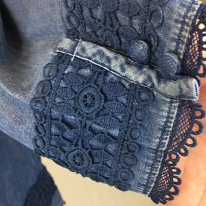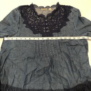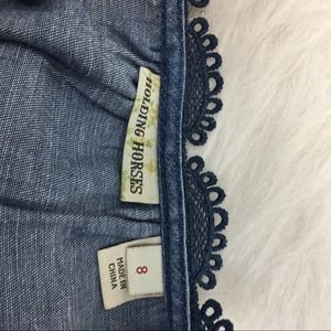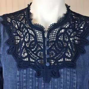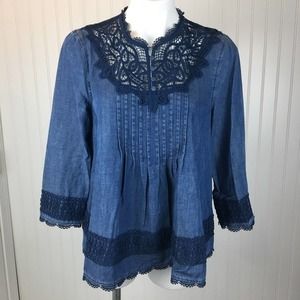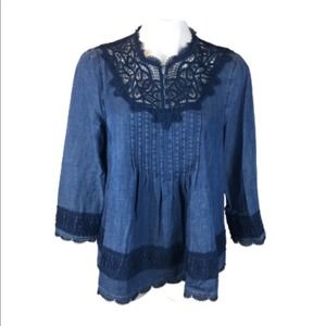 Anthropologie | Holding Horses Chambray Pilgrim Top. Beautiful ornate blue Venetian lace along neckline. Pleated in front with embroidery and lace along bottom. 3/4 length sleeves with more lace. Blouse is in very good gently-used condition.