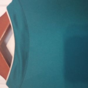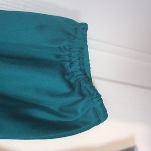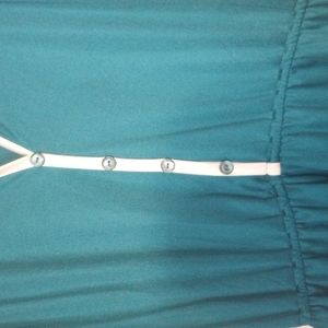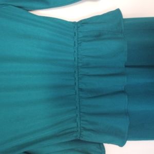 Sears Vintage JR Bazzar dress, EUC, silky like feel, stretch band fitted waist, button up front with V neck, is missing size tag, bell sleeves, size is like a medium. color is a turquoise/ dark green color. measurements are below: