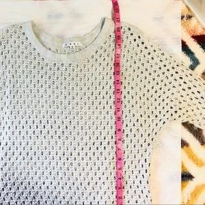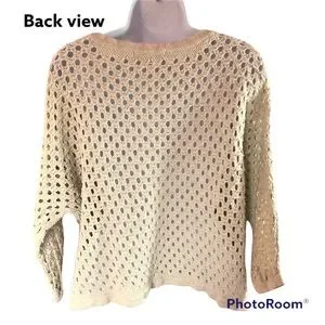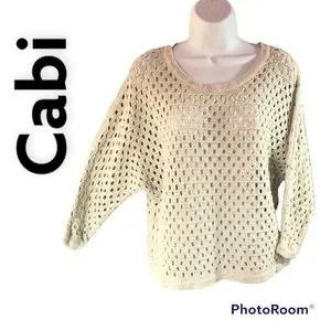 Cabi women light gray knit crochet top, long sleeve, see thru, round neck Sz S