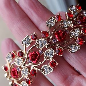 Clear and red rhinestones with red tiny metal red roses in the middle of each piece of this bracelet