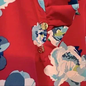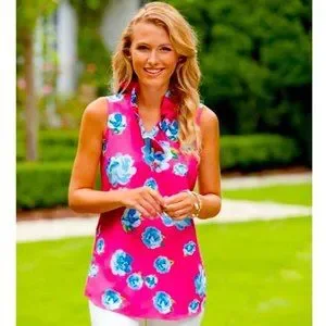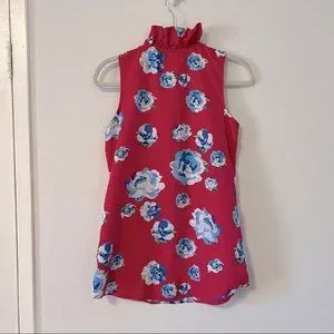 The vibrant magenta and blue floral print and ruffled neckline make this sleeveless tunic a wardrobe stand out.