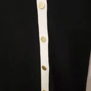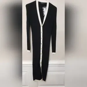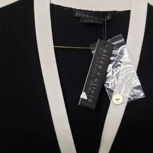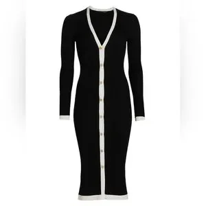 The Alcina sweater dress from Alice + Olivia is crafted of a fitted wool-blend rib-knit. Contrast trim and goldtone button closures finish this midi-length style. Plunging V-neck. Long sleeves. Button front closure. Goldtone hardware.