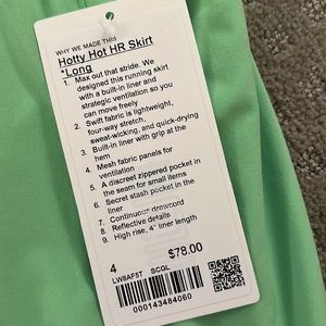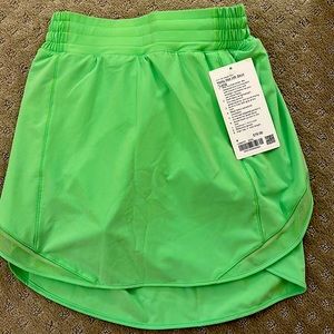 NWT, neon green Lululemon hottie, hot HR skirt Long, 15 inch, design for running , Pickleball, tennis skirt with built-in liner and the fabric is lightweight with grip on at the hem mesh fabric panels for ventilation , discreet zippered pocket in the same for small items, secret stash pocket in the liner, continuous draw cord reflective details high rise, 4 inch liner length