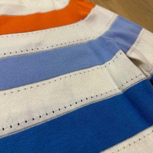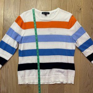 Brooks Brothers striped sweater in excellent condition and from a smoke-free home. White sweater with blue and orange stripes, and some silver stripes mixed in as well. The material is soft and has stretch to it.