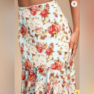Lulu’s high-low, light blue with floral print maxi skirt. NEW! Lightly ruffled hem. This skirt is beautiful!