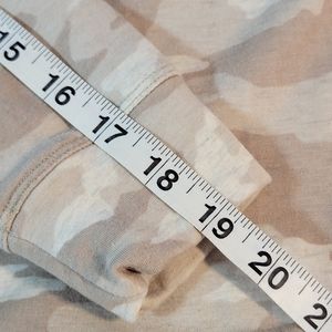 Great Athleta sweatshirt camo pattern. Stretchy 6% spandex. Normal wear slight puliing in high traffic areas was addressed with a sweater shaver. Further cleaning and tlc may help it look even better. Very small light wear marks pictured.