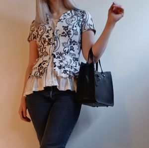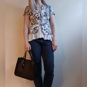 Worn only a couple of times this piece has a beautiful lining and will elevate any pair of pants or compliment any skirt. The short sleeves are perfect for staying cooler and who doesn't love a fluted hem for an extra feminine style!
