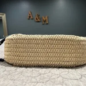 VINTAGE BRIGHTON COLLECTIBLES STRAW HANDBAG WHITE/NAVY BLUE STRIPE INTERIOR GENTLY USED