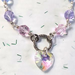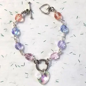 Beautiful Pastel Faceted Glass Beads in Pink, Purple, Blue & Peach are all Wire Wrapped in Silver Designer Wire with a Sweet Heart Shaped Toggle Clasp Closure. The Center Has an Open Etched Silver Ring with a Beautiful Heart Shaped Crystal Dangle! A Gorgeous Gift!
