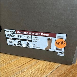 Women’s size 8.5 Ariat boots. Heritage Western R-toe. Color is a distressed brown with a 12” shaft height. Only worn twice. We paid $170 for them. No low ball offers, please.