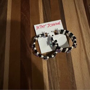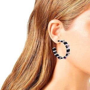 Whimsical black and white striped resin open hoops adorned with colorful flowers and delicate stone accents. These vibrant earrings are set in polished gold-tone metal and have a post back closure.