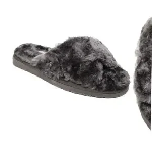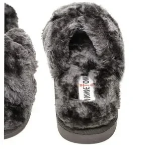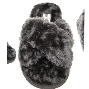 Treat your feet with the cozy comfort of a cross-band slipper warmed with fluffy faux fur and faux shearling and grounded by a slip-resistant rubber sole.
