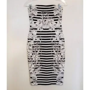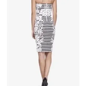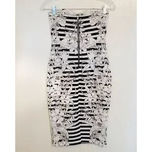 NWOT Express Strapless Floral Striped Black White Knee Length Bodycon Dress US 2