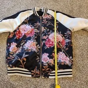 Super cute women's bomber jacket with a fun floral pattern on the front and zippered pockets in excellent condition