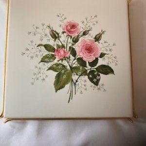 Cottage Core Vintage Porcelain Pink Rose Trivet Banded in Gold Metal Two small flea bites at corners - barely visible Gold Metal Banding Intact Square Shaped 6. 5" x 6. 5" Some markings on back commensurate with age Vintage Item Very Pretty Piece