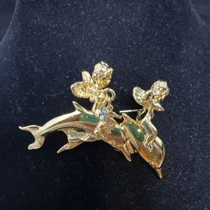 Kirks Folly Gold Tone Cherubs Riding Dolphins Brooch (4178)