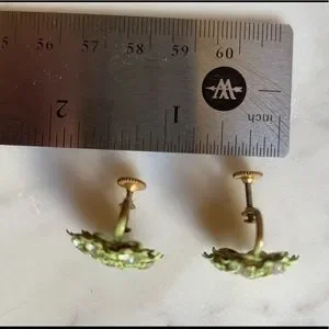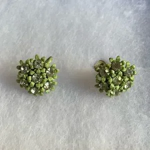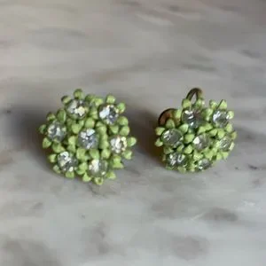 These sparkly stunners date back to the early 1960’s. Made of glass rhinestones and light green enamel painted metal, the floral earring add a touch of class to any ensemble. These earrings have screwback posts and can be worn with both pierced and unpierced ears. In great vintage condition with no missing stones.
