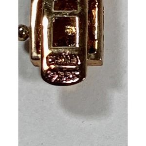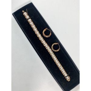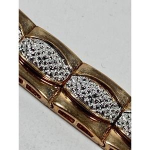 Nice Technibond 925 Sterling bracelet and earrings have a gold wash and very tiny accent diamonds, 6 on the bracelet and 1 on each earring. Bracelet measures 7 1/2" by 3/8" wide. Earrings are 6/8" across in diameter by 3/8" wide. Pre-owned in original box.