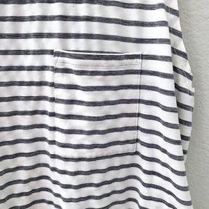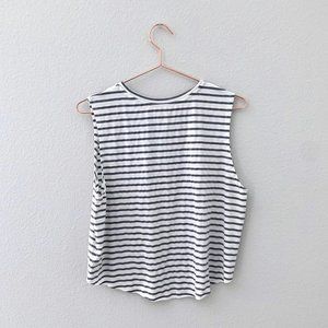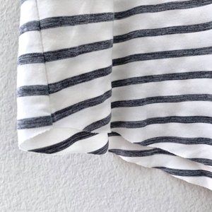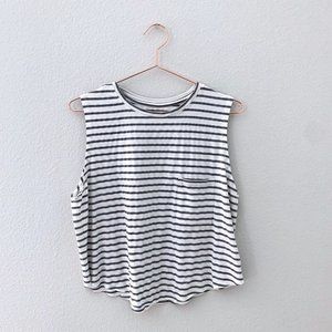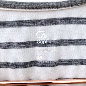 Striped workout tank top from Gap. Muscle tank style with a front pocket. Slightly cropped length. White with grey stripes. Lightweight and breathable fabric.