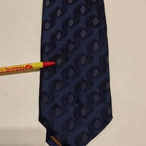 Vintage. There's a very faint white spot on one of the ovals (last pic) that I'm 99% sure will come out when cleaned. I was able to get some off with my nail so I know it's not anything that's deep in the fabric. But either way, it's not noticeable unless someone is thoroughly examining your tie. Imported silk. Hand sewn. Great quality brand. Made in the USA. Dark blue with a darker wavy pattern in the background. Measurements are approximate: Length 57" Width 4". Feel free to ask any questions or for more pictures. Smoke free/pet friendly home. Thanks for looking!