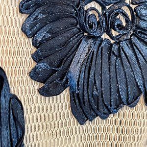 Gracia Floral Lace Mesh Peplum Top had exquisite embroidered detail. The ribbon-like embroidery is a rich navy paired with a structural mesh silhouette in cream. The mesh is transparent (shown in the second to last photo), so it works well with a cream bandeau or camisole underneath. The fit doesn't hug the body too close so you could layer a long sleeve blouse underneath for a new look. The peplum starts at the waist and has a "high-low" cut line. The front of the top hem hits just below the waist, so it can be worn with a high or low waist pant or skirt.