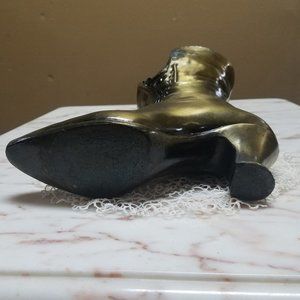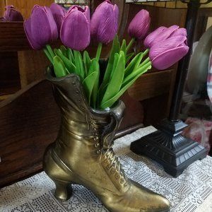 This unique boot vase is in great condition for it's age. Brass is tarnished in a couple areas and had a break that was mended at the top, but not noticeable when displaying flowers. Does not include the lifelike foam flowers, but I am going to be selling them for $8. So ask and I'll put a listing for them.