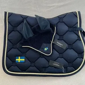 New, unused, limited edition ES Go Sweden jump pad and ear bonnet. True Navy with pale silvery-gold piping. Gorgeous and elegant! Imported from Sweden.