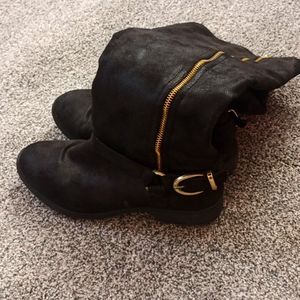 knee high black boots with gold detail