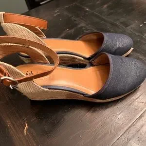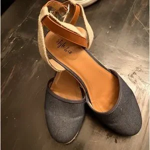 Size 7 1/2 style and Company closed toed ankle strap, buckle denim color shoes