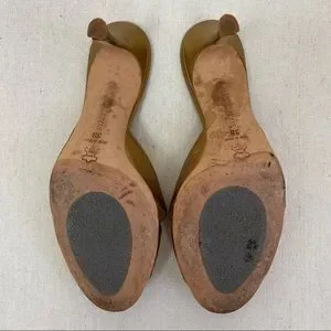 Beautiful Manolo Blahnik Gold Leather Embellished Mules/Sandals featuring leather upper with yellow crystals, leather lining, leather soles.