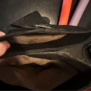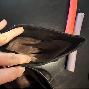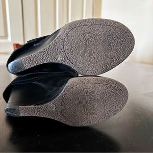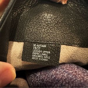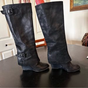 Vince Camuto VC-Autumn “Black Silk Goat” genuine leather outer hooded/sheath stacked wedge knee high pull on boots size 7B/37!! Buckles at top and ankle are adjustable!! In excellent/like new used condition!!! Super cool boots and the leather is super soft!!!