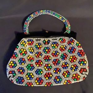 Vintage beaded purse in amazing shape. Made in Hong Kong. Unique metal clasp on black plastic frame. The inside is black and has 1 small pocket on the handle side of the purse. The colored beads are all still attached, no wear shows on the hard to find gem. Measurements are 10” wide at top of frame and 13” wide at widest part of the purse. Large Beads are red, blue, green & yellow and placed randomly for color. Small beads are white.