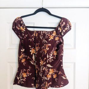 Style: Women's Deep Plum and Floral Off the Shoulder Fitted Cap Sleeve Blouse with Front Button Detail, a Smocked Panel on the back, and a Sweetheart Neckline