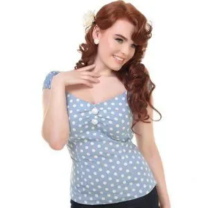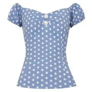 This retro gypsy style blouse in dusky blue with white polka dots features puff sleeves, a sweetheart neckline, and nipped waist, to really flatter your figure. Dress down with some dark denim or up with a swing skirt. This cheerful piece will be an essential you will reach for again and again. Rockabilly Pinup style with princess seams. Elastic on sleeves. Side zip. 90% cotton, 10% spandex. Size small, UK 10. Dusky Blue 28-S-10 CVSS150414C