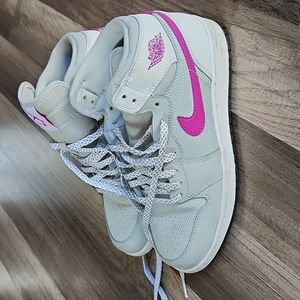 Nike Air Jordans. In good condition. size 6Y. color Fusia and Gray. Small stained please check photo #4. and #7