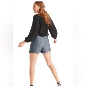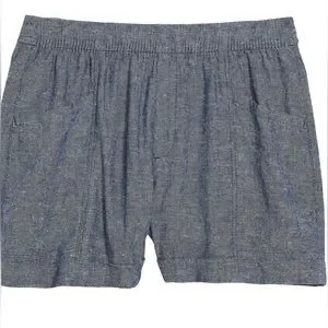 These high waisted linen blend have a 3.5 inch inseam. They are incredibly soft and comfortable. They have an elasticized waistband with a drawstring fastening. They have a cuffed leg and pockets! We always need them!
