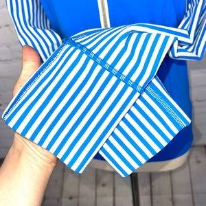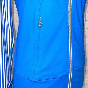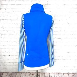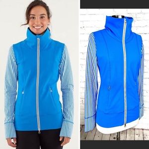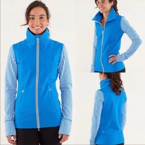 Lululemon Daily Yoga Jacket. Beaming Blue / Classic Stripe Polar Cream Beaming Blue. We designed this jacket to be a versatile layer we can pull on pre- and post-class. The loose fit and tall, cozy collar make it an easy piece to transition from class to cafe and home again. It's the piece that keeps us moving. Ok...coffee helps too. Key features the loose fit hugs you at the hips to help keep your core warm big, cozy collar helps keep your neck warm store your essentials in the secure zipper pockets don't get pinched! the zipper garage helps protect your chin chafe-resistant flat seams so you don't get rubbed the wrong way preshrunk for hassle-free laundry Tech specs designed for: yoga, to-and-from fabric(s): luon® properties: four-way stretch, moisture-wicking, preshrunk, chafe-resistant, breathable fit: loose length: mid-hip.'