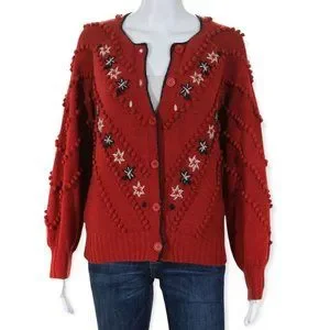 The Great. Meadow Bobble Cardigan in Red. Features button front closure, long billowed sleeves, bobbles and starflower embroidery, ribbed cuffs and trim. 60% cotton, 40% acrylic.