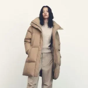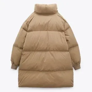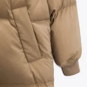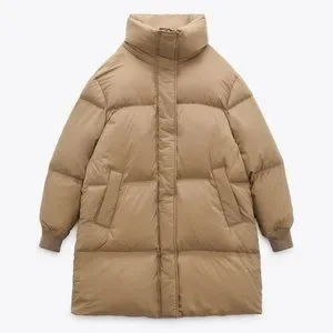 Puffer coat with a blend of down and feather fill. Extra padded high collar and long sleeves with elastic cuffs. Front pockets and hidden in-seam interior pockets. Its fill provides better comfort and protection from the cold. Regular fit. Front hidden zip and snap button closure.