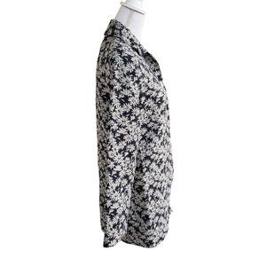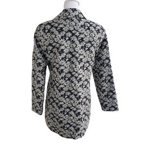 This is such a pretty jacket with a floral tapestry design. I am trying to figure out the colors. It is either a really dark blue and grey or a black and grey. My eyes have trouble with some colors. The pictures are accurate of the colors. Brand is Marshall Field's. Coat is fully lined. Outer material is 65% Cotton, 19% Viscose, and 16% Nylon. The lining is 65% Acetate and 35% rayon. Dry clean only. It is tagged a size 6. Coat is lightweight and more of a jacket for slightly cool weather. There is one small stain below one of the buttons. there is a zoomed in pic of it.