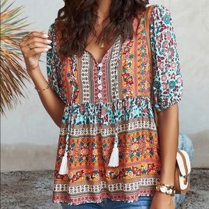 🧡 BOHO BLUE ORANGE MULTI FLORAL LOOSE FIT TOP!