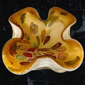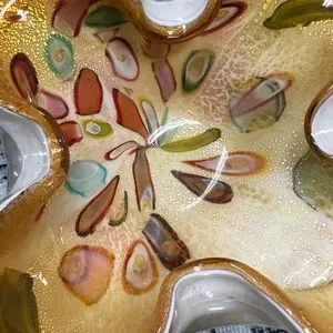 This is absolutely stunning. The aventurine is so eye catching and bright. Beautiful murrines with a hollowed look of the canes. There are no chips or cracks. There are light scratches on the base and underside of bowl. An exceptional piece of Murano