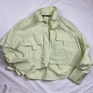 Zara Womens Green Button Front Shirt Boho Crop Long Sleeve Size S A060223