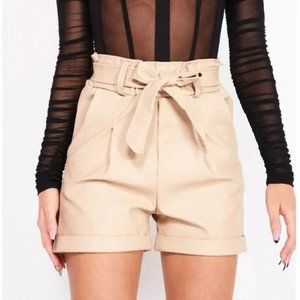 Beige Vegan Leather Faux Leather High Waist Cuffed Paper Bag Waist Shorts