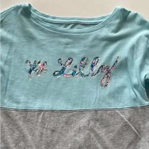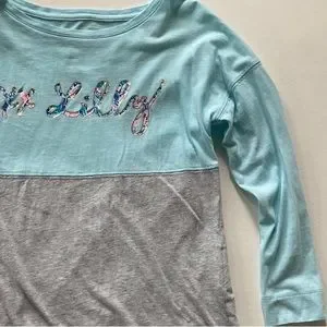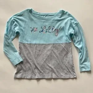 Girls Lilly Pulitzer Mini Finn Top Blue Oasis Tint. Super cute for your little fashionista! Color block blue and grey. Long sleeves. 100% cotton. Size Girls Medium. Great condition with slight signs of wash and wear.