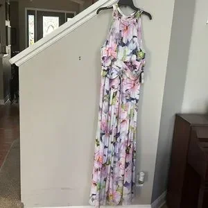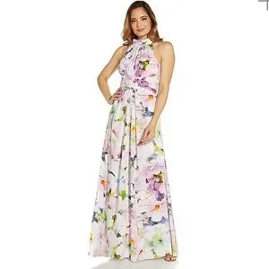 This Is A Mock Neckline Halter Gown With A Pleated Sash Waist In A Floral Printed Stretch Chiffon.
