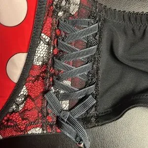 Great condition Cacique Bra S 44DDD.this is red with white dots throughout.This has black lace on the underarm area.It has black lace above the cups.There is a black bow with silver metal look hanging from the bow.There is also black ribbon that crisscross near the underarm area.The straps are adjustable and the band is nylon with a nice stretch to it.This has very little padding.The underwire is in black.Such a beautiful bra