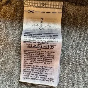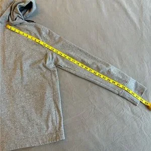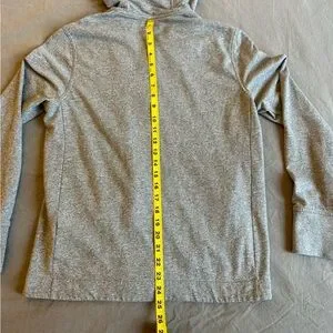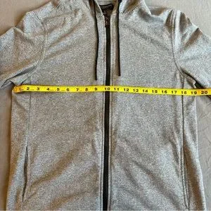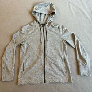 For sale is a Banana Republic Core Temp Terry hooded sweatshirt/hoodie in Heather Gray, men's small. I bought this sweatshirt new in November 2020 and wore it just a few times since. The sweatshirt is in good used condition with no significant wear. The sweatshirt is made of a slightly stretchy, relatively thin cotton/polyester material. The sweatshirt is heather gray with a black zipper and drawstrings. There are two side pockets and a hood.
